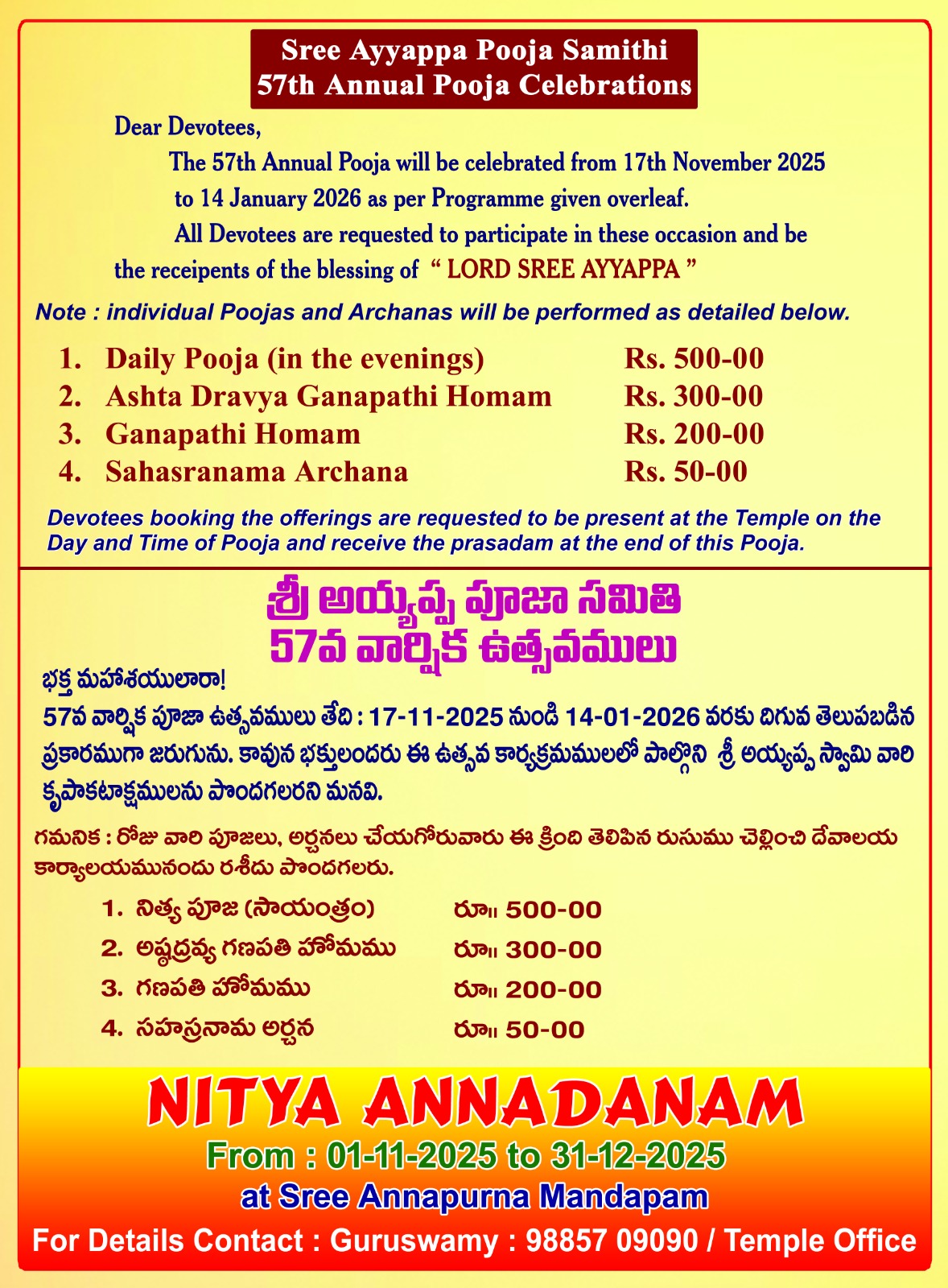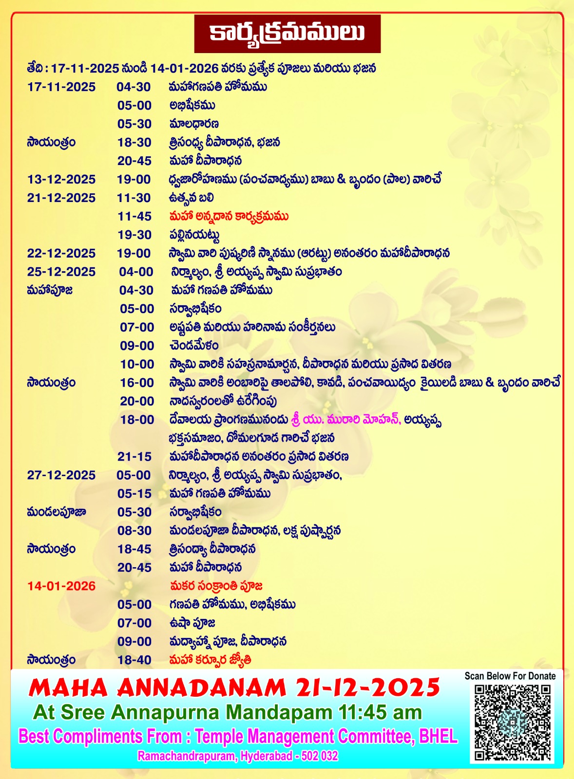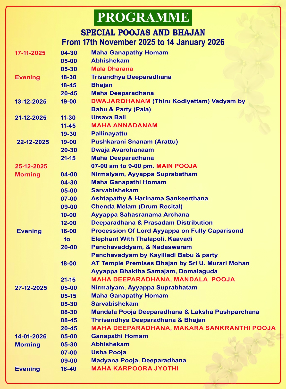 On the auspicious occasion of NAVARATRI (22/09/2025 – 02/10/2025) the following programs will be held at BHEL Ayyappa Temple: